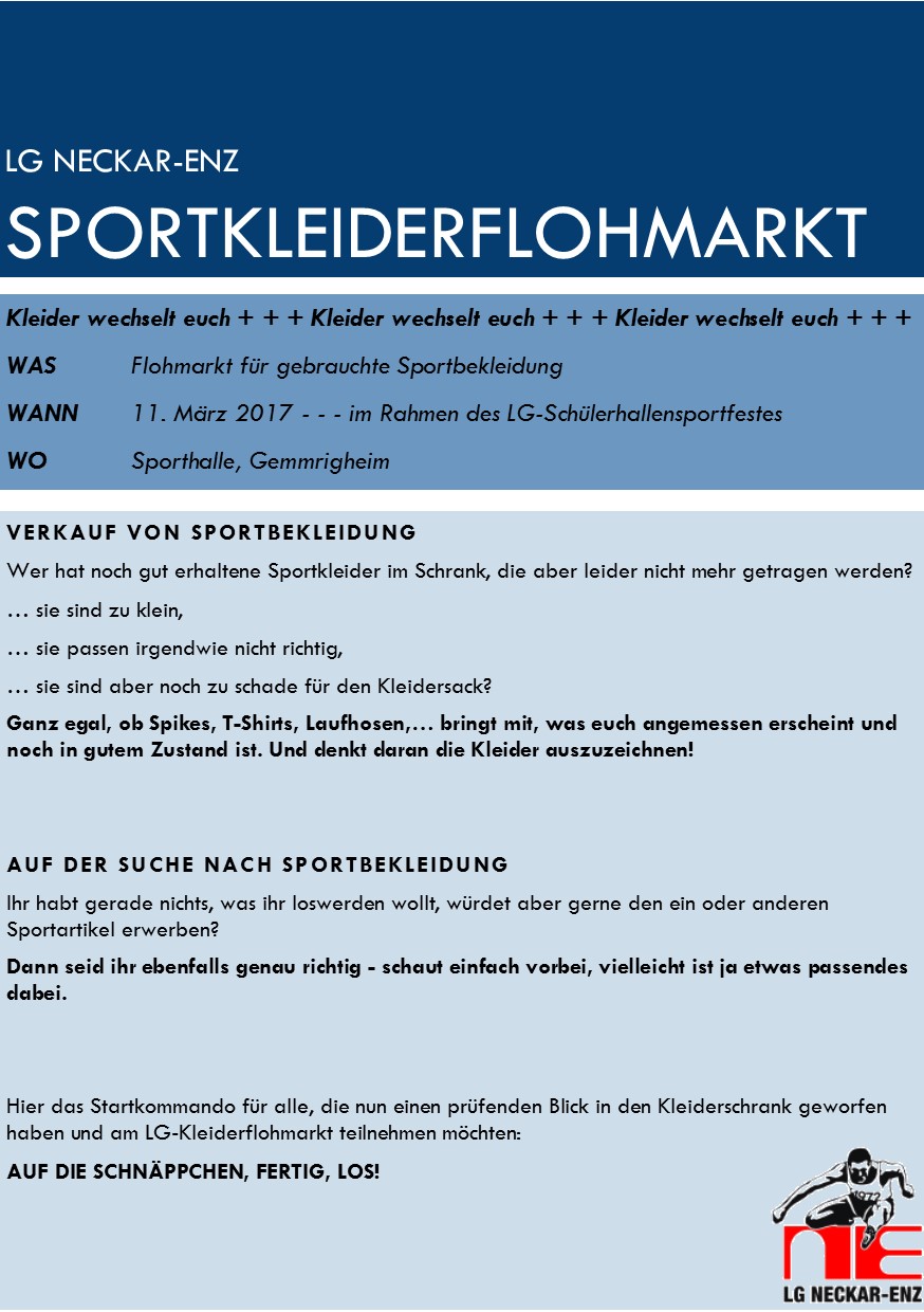 Im Rahmen des Hallensportfestes wird es auch den 4. Flohmarkt für gebrauchte Sportbekleidung geben. Alle Details findet Ihr im Flyer.